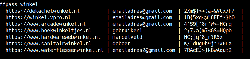 Voorbeeld van output als ik ffpass winkel type laat hij alle wachtwoorden van sites met de zinsnede "winkel" zien: