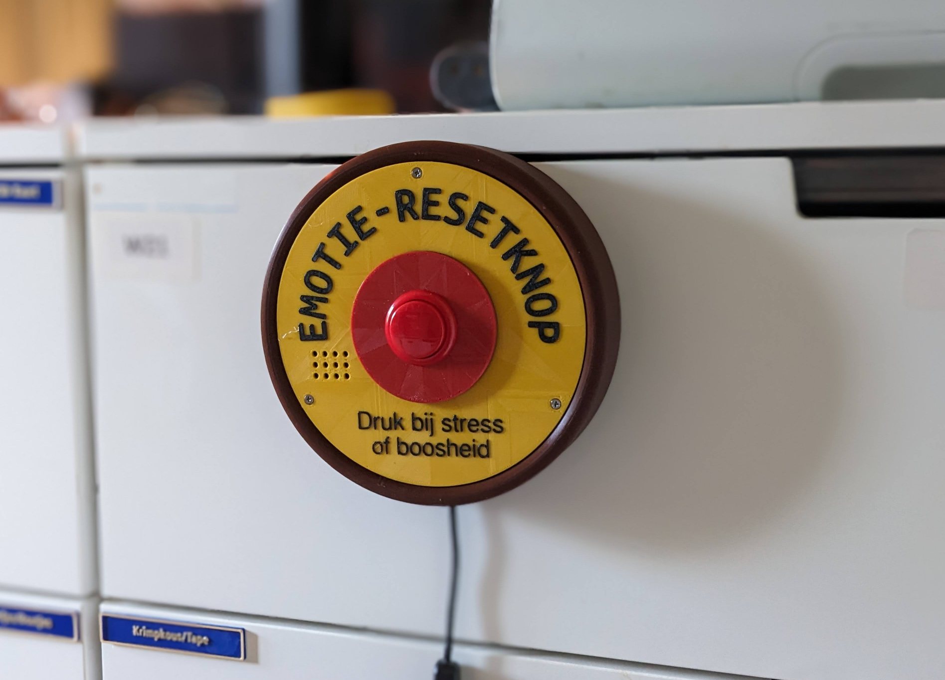 Een simpele, fysieke grote rode knop aan de muur. In je werkkamer. In de keuken. Bij de trap. Wanneer je voelt dat de druk oploopt — dat je emoties je overspoelen of je hoofd te vol is — druk je op de knop.