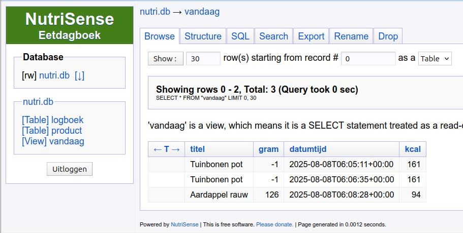 Zowel de lijst met producten (tags) als het eetlogboek worden opgeslagen in een SQLite database. Op een lokaal gehoste server bij mij thuis draait een Apache webserver met een PHP-applicatie die alles regelt. Ik heb ook nog de phpliteAdmin-app toegevoegd zodat je de data in de database kunt bekijken, bewerken en analyseren.