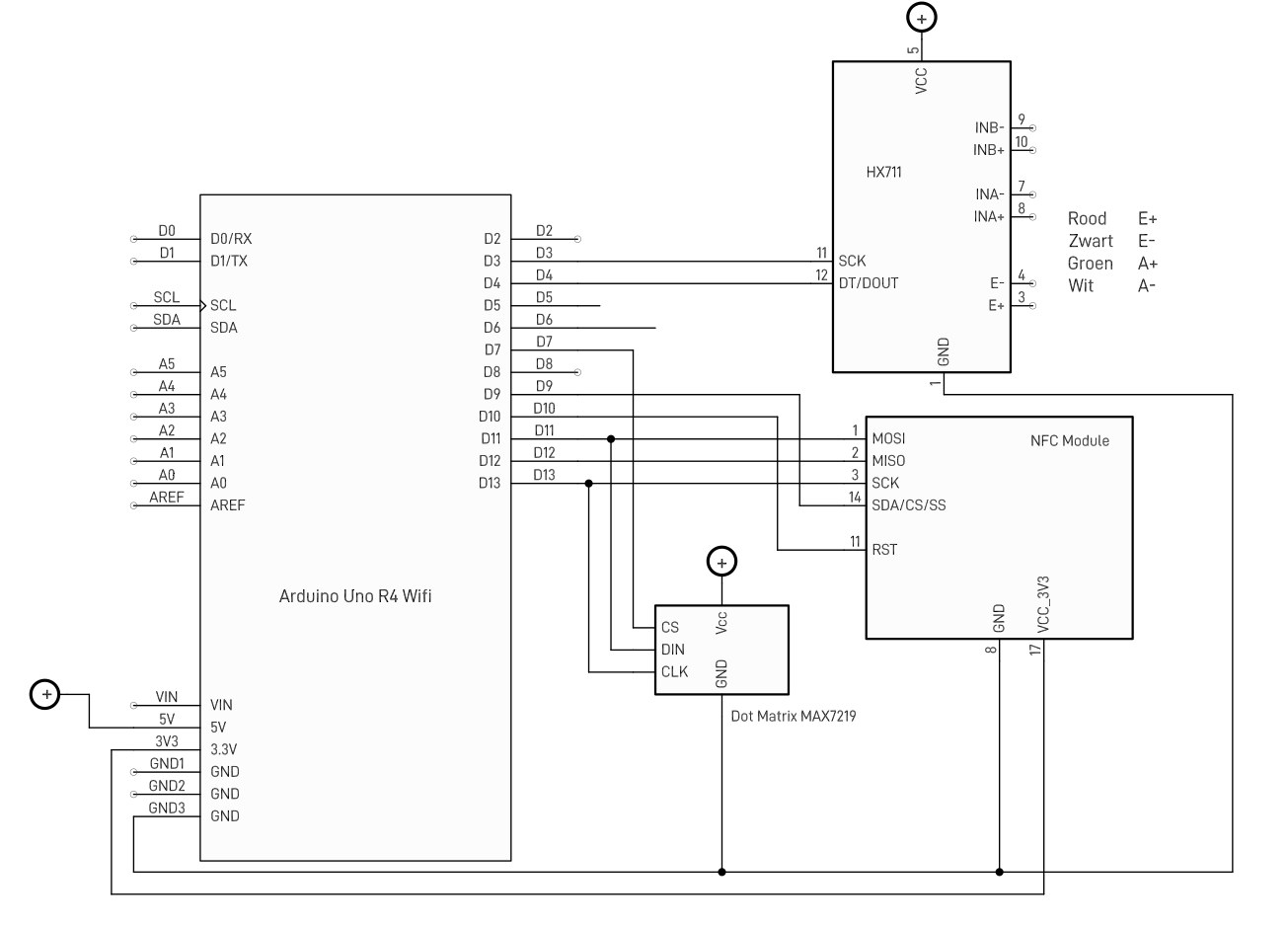 In het schema zie je dat zowel het display als de RFID-taglezer gebruik maken van de pennen D11 en D13 van de Arduino. Op internet zie je deze oplossing niet vaak terwijl het wel standaard zo bedoeld is voor apparaten met een zogenaamde SPI-aansturing. Werkt prima zo!
