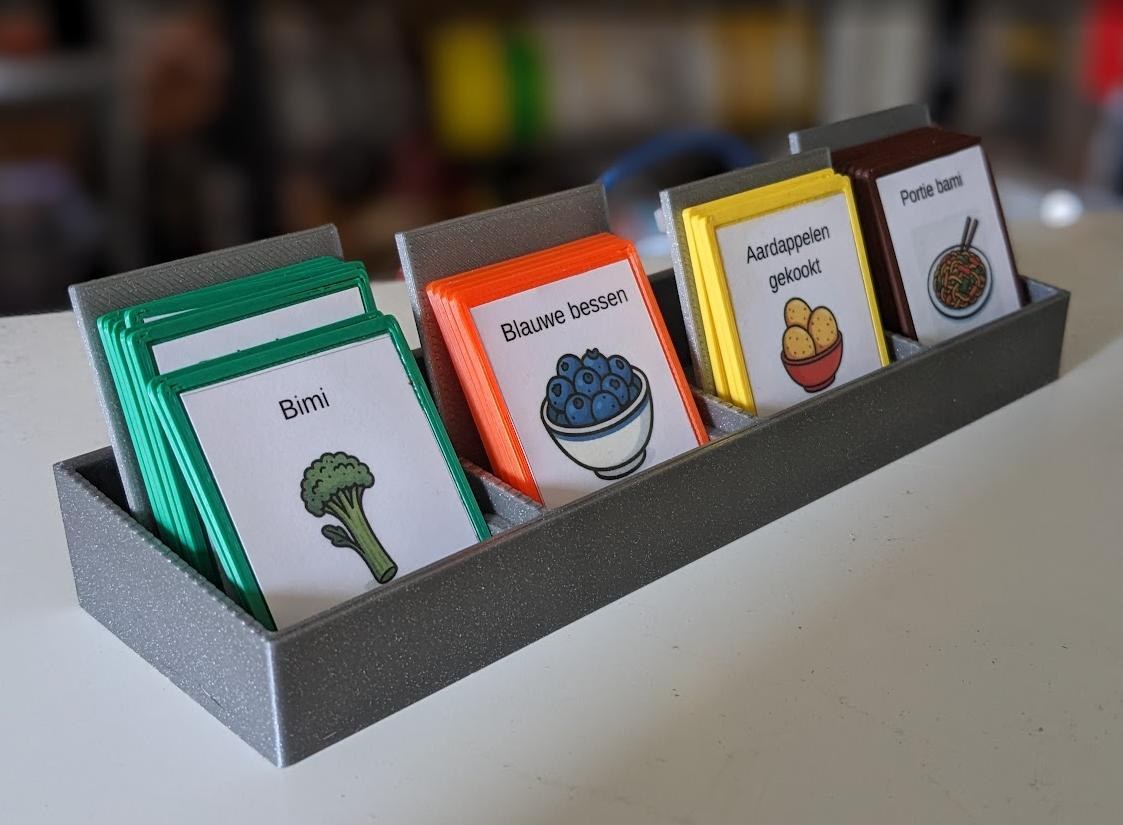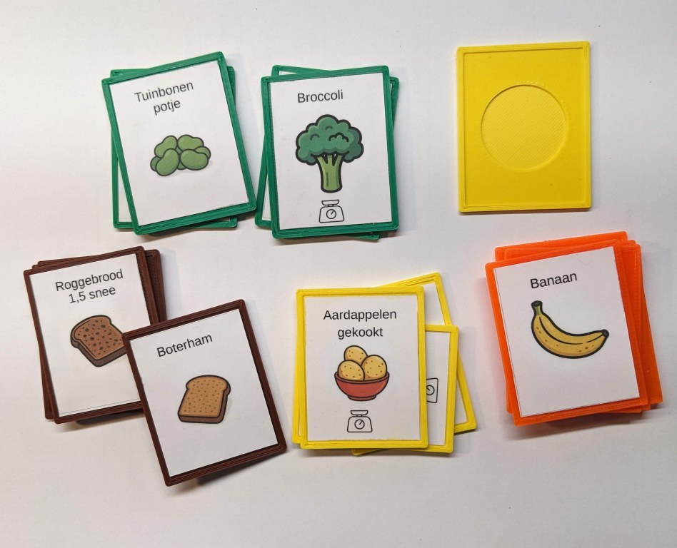 De RFID-tags zijn ge-3d-printte kaartjes waar een RFID-sticker in is verwerkt. Om snel de juiste tag te vinden zijn ze geprint in diverse kleuren, per categorie voedsel een kleur: