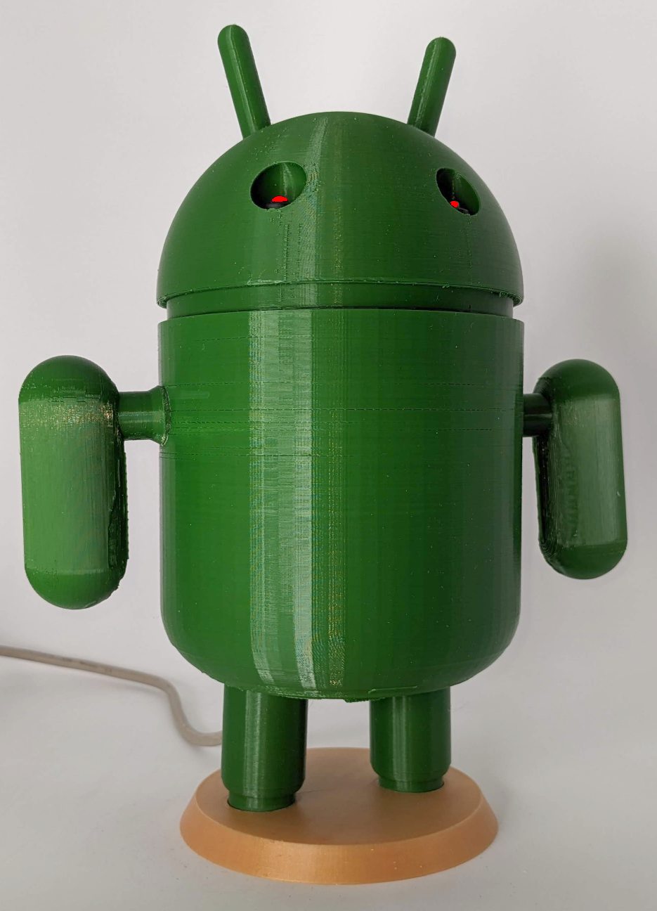 Ik sta wel eens op de open dag van de school waar ik werk uitleg te geven over programmeren met Kotlin voor het maken van Android-apps. Als aankleding van de stand op die open dagen heb ik een klein (30cm hoog) robotje gemaakt dat met zijn knipperende ogen de aandacht trekt.