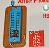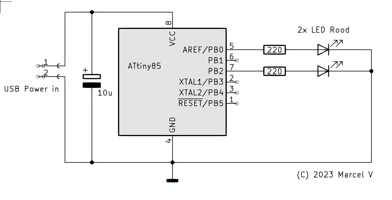 Aan de binnenkant zit een ATtiny85 (zie schema) met een simpel programmaatje dat de LED-oogjes van de robot in een aantal variaties laat knipperen: soms om en om, soms tegelijk, dan weer snel en dan weer langzaam.